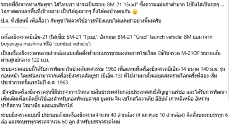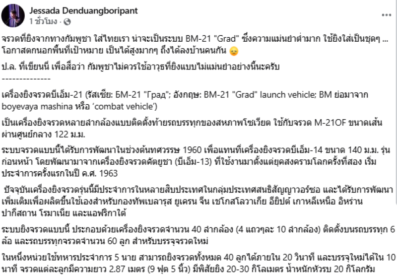 วันที่ 24 กรกฎาคม 2568 ดร.เจษฎา เด่นดวงบริพันธ์ อาจารย์ประจำภาควิชาชีววิทยา คณะวิทยาศาสตร์ จุฬาลงกรณ์มหาวิทยาลัย ได้ออกมโพสต์ผ่านสื่อสังคมออนไลน์ กรณีเหตุการณ์จรวดจากฝั่งกัมพูชาพุ่งตกในเขตไทย โดยระบุว่า จรวดที่ใช้ในการยิงครั้งนี้คาดว่าเป็นระบบ BM-21 Grad ซึ่งเป็นอาวุธประเภทจรวดหลายลำกล้องที่มีจุดเด่นคือการยิงเป็นชุดจากท้ายรถบรรทุก แต่มีข้อจำกัดเรื่องความแม่นยำ ทำให้มีโอกาสพลาดเป้าหมายและตกกระจายออกนอกพื้นที่เป้าหมายได้สูง